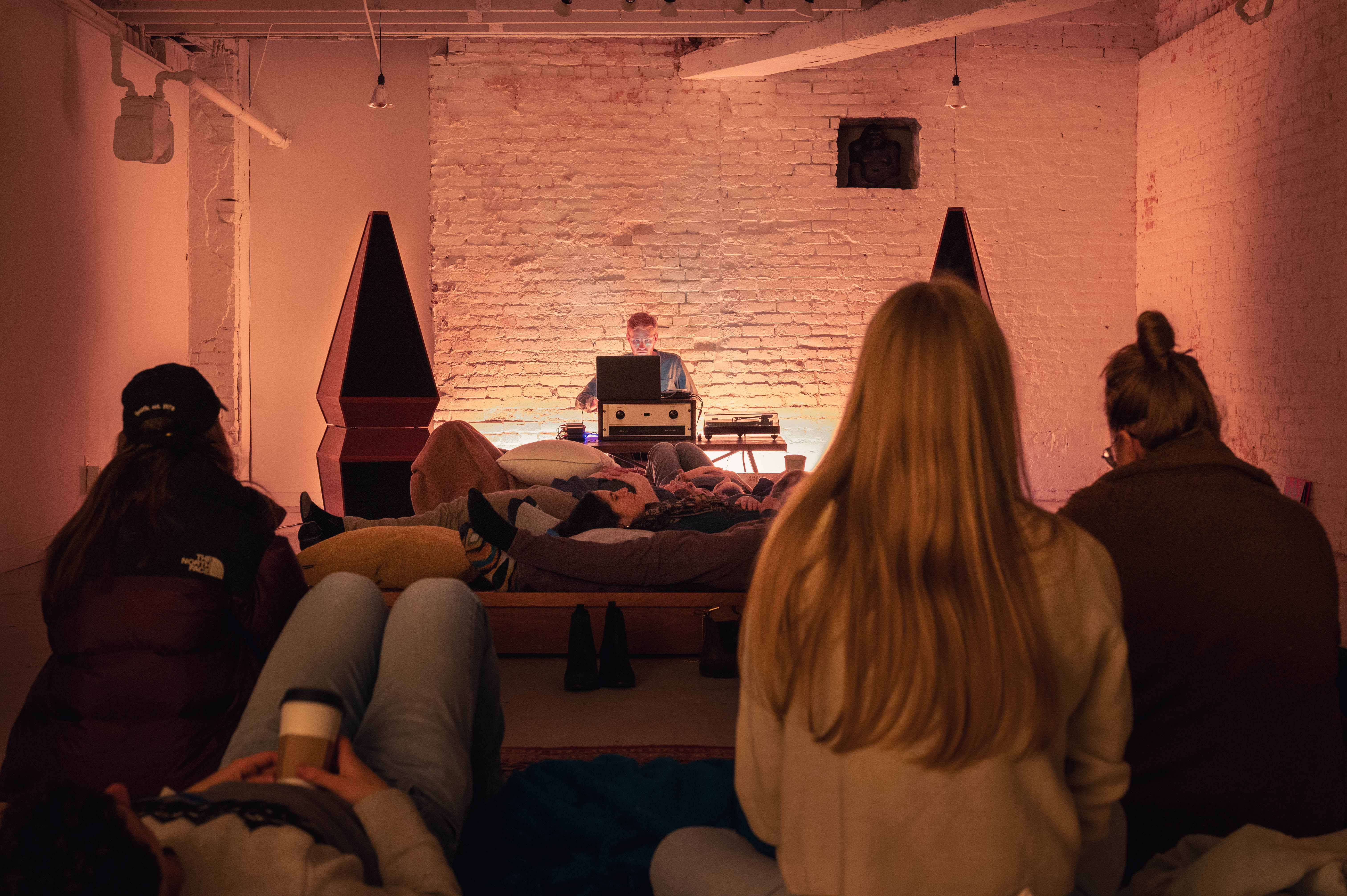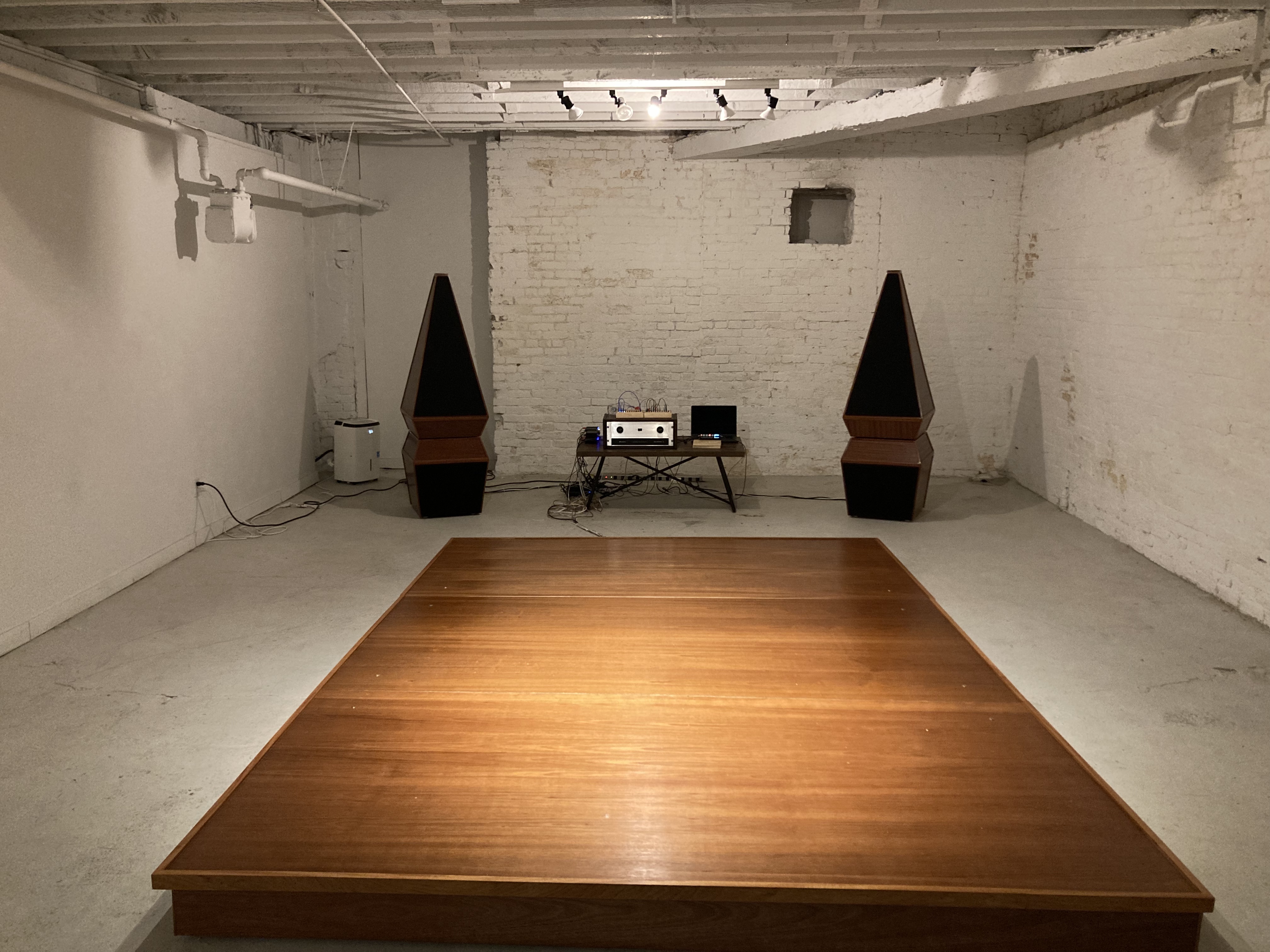 Custom designed jatoba floor with coupled audio transducers and contact microphones for controlled sound and vibration feedback processing